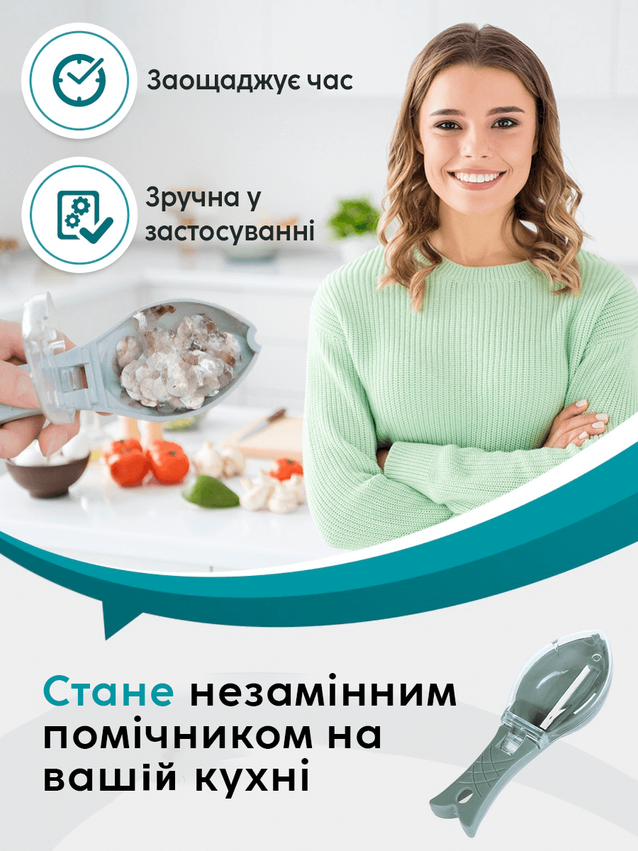 Пристрій має інноваційний пружинний механізм, що забезпечує швидку і легку обробку продуктів.