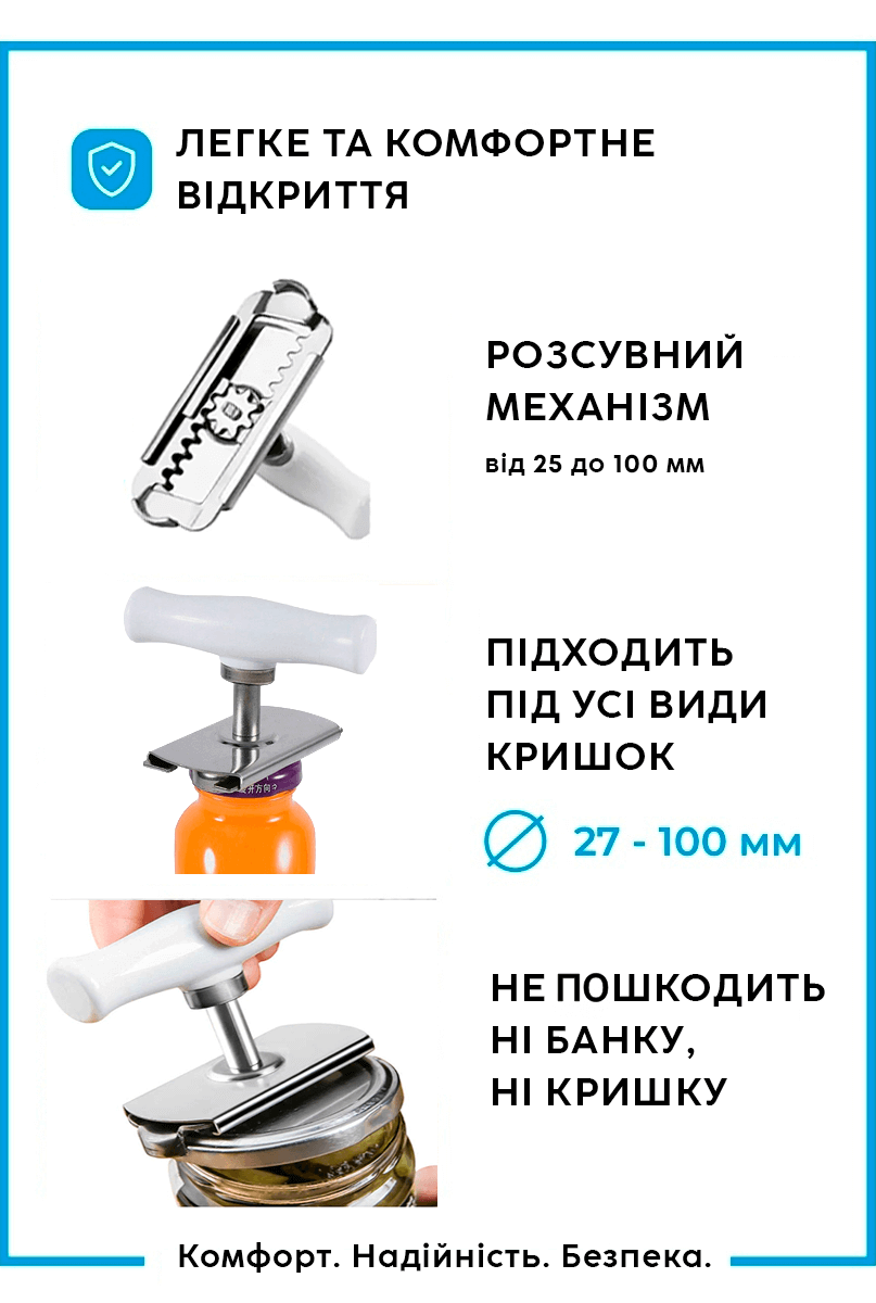 Відкривачка для банок виготовлена з нержавіючої сталі. Пристроєм неможливо пошкодити ні банку, ні кришку!