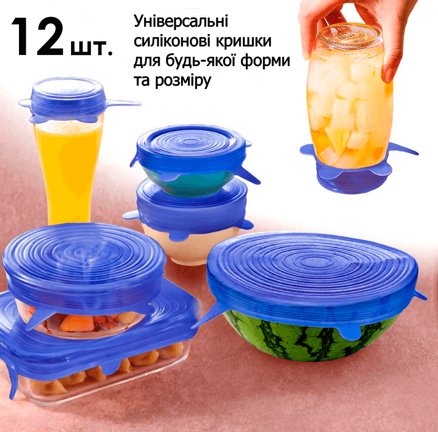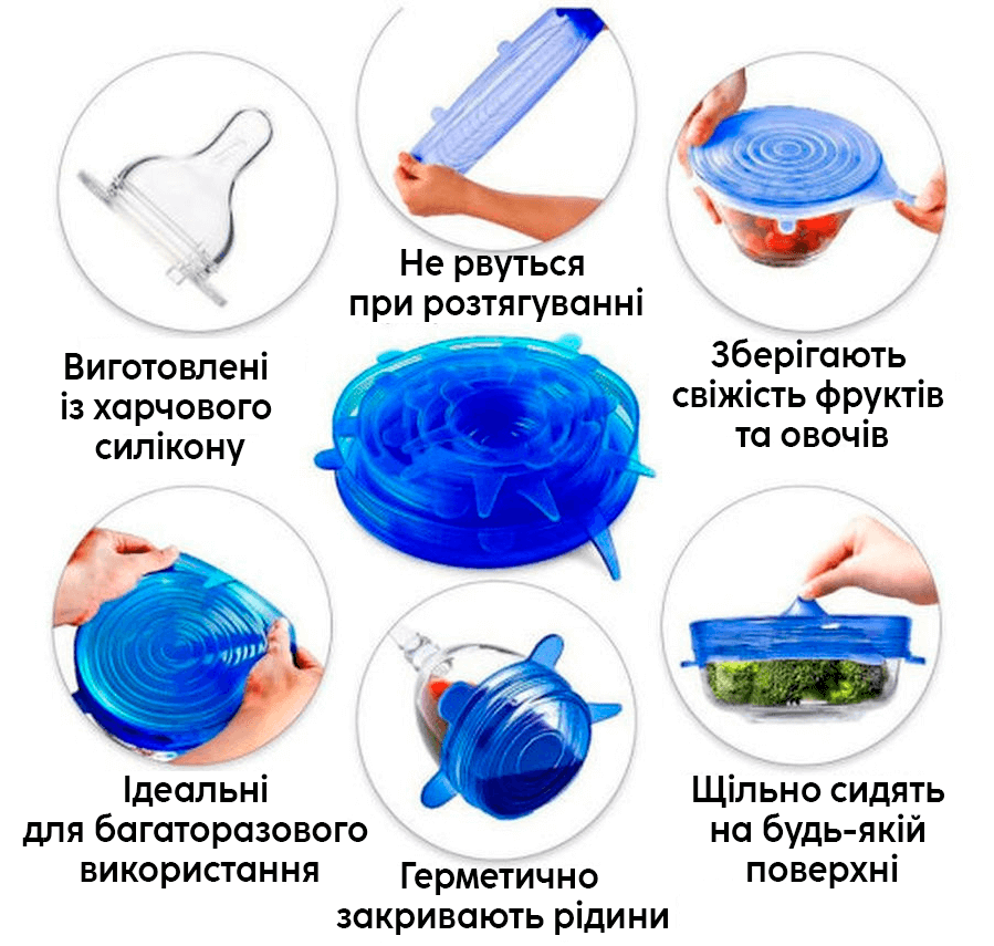 Силіконові кришки, що розтягуються, можна одягати на тарілки, каструлі, банки, контейнери, а також на самі продукти, наприклад, на половинку кавуна або дині.